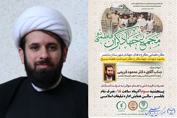 وی از برگزاری دومین گردهمایی گروههای جهادی شهرستان بابلسر با عنوان مجمع «جهادگران فاطمی ۲» خبر داد و گفت: این گردهمایی پنجشنبه،3 آذرماه با یاد شهدای جهادگر و گرامیداشت هفته مبارک بسیج و با همت شورای جهادی، اداره تبلیغات اسلامی و بسیج سازندگی سپاه ناحیه شهرستان بابلسر برگزار میشود.