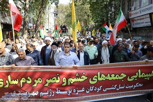 در طول این راهپیمایی، پلاکاردها و بنرهایی به چشم میخورد که پیامهایی از جمله « مرگ اسرائیل نزدیک است»، «فلسطین زنده است»، «غزه تنها نیست» و «قدس پایتخت همیشگی فلسطین»را حمل میکردند. همچنین، افرادی از اقشار مختلف جامعه در این حرکت اعتراضی شرکت کردند، که نشان از عمق احساسات و همبستگی ملت ایران با مردم فلسطین و محکومیت جنایات رژیم صهیونیستی داشت.